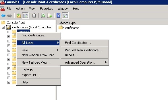 – Để tiến hành import SSL, trong phần Certificate (Local Computer) chọn Personal -> All Task -> Import