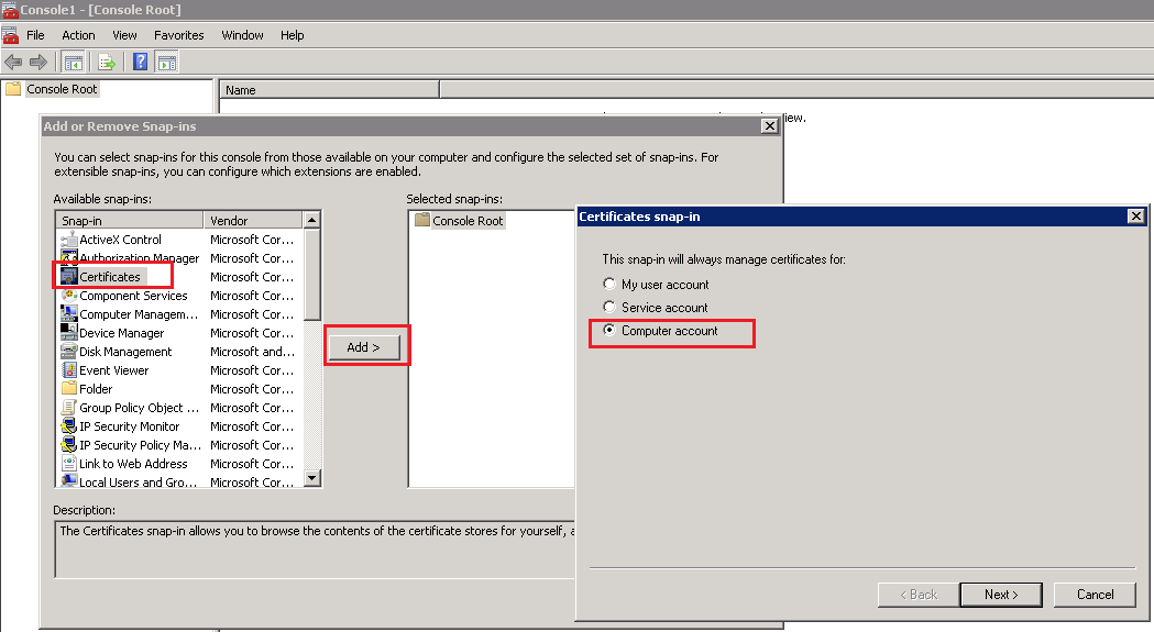 – Chọn Certificates, click Add, chọn Computer Account và click vào Next