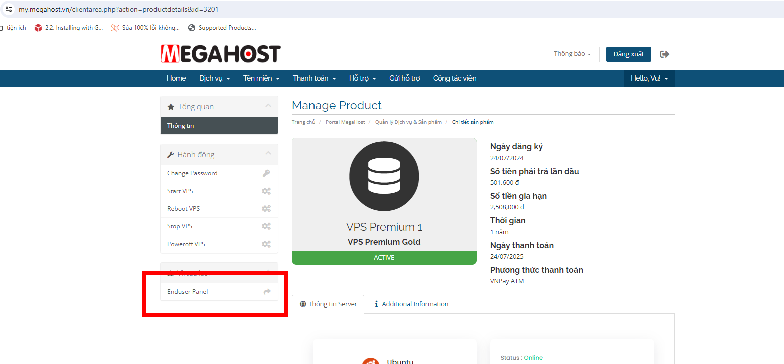 1. Tại trang quản lý VPS click vào Enduser Panel
