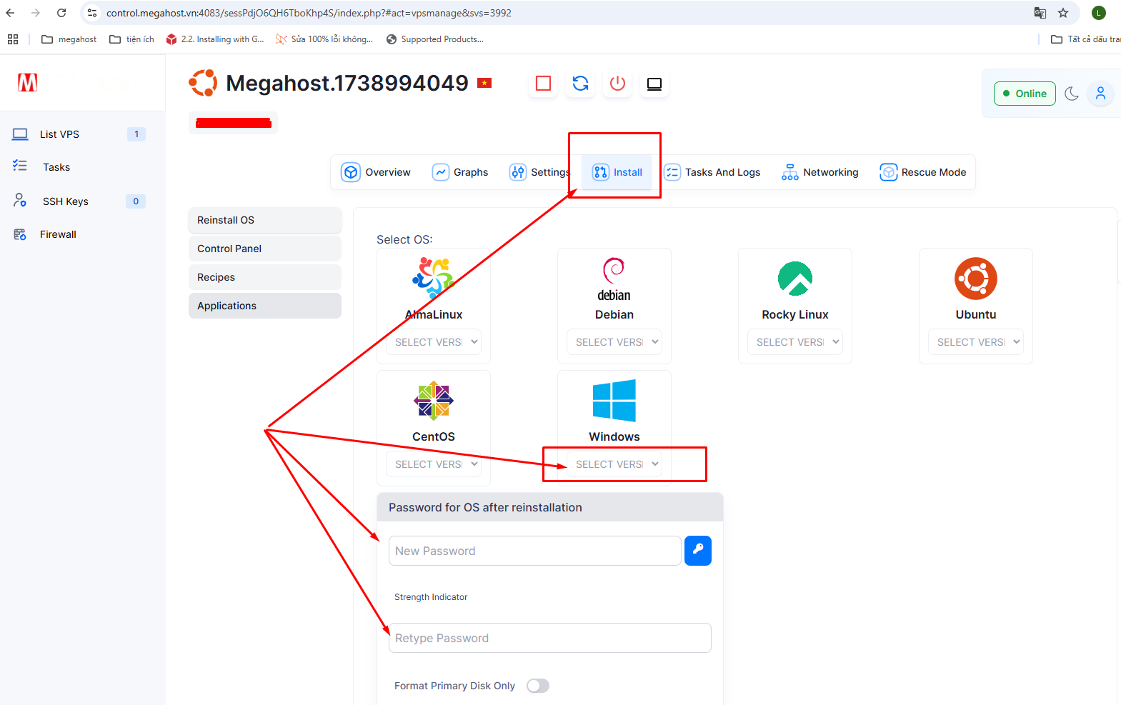 1. Cài lại hệ điều hành mới cho VPS : Chọn hệ điều hành cần cài đặt , điền mật khẩu đăng nhập mới của hệ điều hành .
