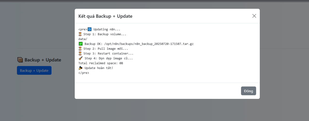 Trong trang quảng lý vps n8n, các bạn chọn tab “Backup” chọn nút “Backup + Update” thì hệ thống sẽ tự động khởi tạo backup container hiện tại và update n8n lên version mới nhất nếu có.