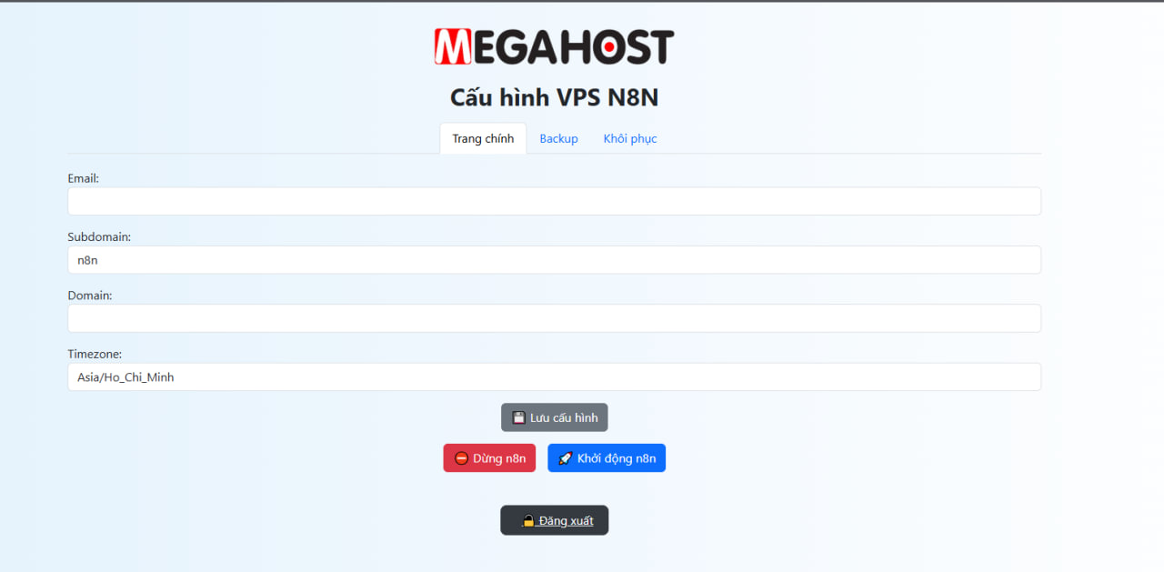 Trang quản lý VPS n8n được thiết kế nhằm đơn giản hóa quá trình cấu hình và vận hành n8n. Tất cả thao tác như cập nhật domain, cấu hình email, sao lưu và khôi phục dữ liệu đều được thực hiện qua giao diện web. Các bạn thao tác theo hướng dẫn sau: