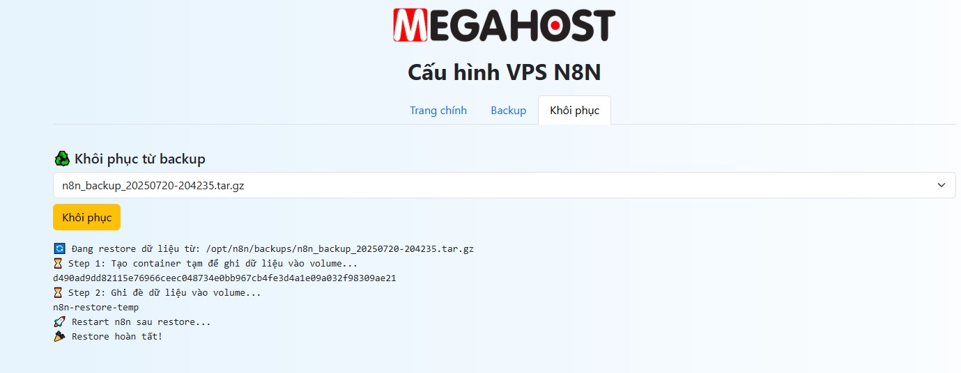 Nếu muốn khôi phục n8n từ bản backup trước đó thì bạn chuyển qua tab “Khôi phục” và lựa chọn bản backup cần khôi phục.